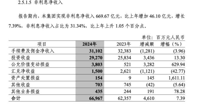 中信银行表示,主要是在市场利率下行期抢抓市场机会,加大交易流转效能,债券、票据等投资收益实现较好增长,2024年该行投资收益和公允价值变动损益分别实现13.3%和629.94%的增长。