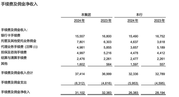 2024 年,中信银行手续费及佣金净收入311.02 亿元,同比下降 3.96%;具体来看,主要是银行卡手续费、代理业务手续费、担保及咨询手续费出现不同程度的下滑,分别为155.58亿元、49.81亿元、49.97亿元,同比分别下滑7.4%、14.93%、4.2%。